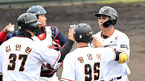 [OSEN=오키나와(일본), 조은정 기자]2일 일본 오키나와 구시카와 구장에서 롯데 자이언츠와 한화이글스의 스프링캠프 연습게임이 열렸다.5회초 2사 1,3루 한화 채은성이 롯데 나균안을 상대로 3점 홈런을 날린 뒤 홈에서 축하를 받
