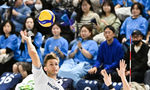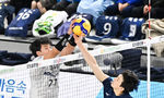 [OSEN=계양체(인천), 박준형 기자] 6일 오후 인천계양체육관에서 '2023-2024 도드람 V리그' 남자부 대한항공과 우리카드의 경기가 진행됐다.2세트 우리카드 송명근과 대한항공 한선수가 공을 다투고 있다. 2024.03.06 / soul1014@osen.co.kr