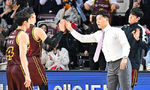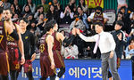 [OSEN=창원, 이석우 기자] 7일 창원 체육관에서 2023-2024 정관장 프로농구 창원 LG와 대구 한국가스공사의 경기가 열렸다. 창원 LG 조상현 감독이 2쿼터를 끝내고 11점차로 리드한 가운데 선수들과 하이파이브를 하고 있다. 2024.03.07 /