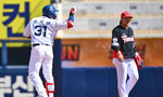 [OSEN=대전, 최규한 기자] 10일 대전 한화생명이글스파크에서 ‘2024 신한은행 SOL KBO리그’ 시범경기 한화 이글스와 삼성 라이온즈의 경기가 열렸다.2회초 1사 1, 2루 상황 삼성 김재성의 선제 1타점 적시타 때 2루 주자 전병우가 홈