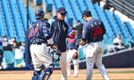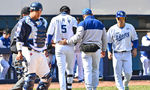 [OSEN=대구, 이석우 기자] 14일 대구 삼성라이온즈파크에서 2024 신한 SOL 뱅크 KBO 리그 삼성 라이온즈와 롯데 자이언츠의 시범경기가 열렸다. 롯데 자이언츠 주형광 코치가 투수 교체를 위해 마운드에 올라 있다. 2024.03.14 / foto0307@os