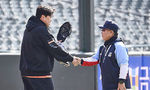 [OSEN=부산, 이석우 기자] 16일 부산 사직구장에서 2024 신한 SOL 뱅크 KBO 리그 롯데 자이언츠와 한화 이글스의 경기가 열렸다. 한화 이글스 류현진이 롯데 자이언츠와의 시범경기를 앞두고 롯데 자이언츠 김광수 코치와 인사를 하