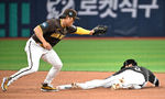 [OSEN=고척, 이대선 기자] 17일 서울 고척스카이돔에서 ‘메이저리그 월드투어 서울 시리즈 2024’ 샌디에이고 파드리스와 팀 코리아의 경기가 열렸다.2회초 무사 1루에서 팀 코리아 1루주자 문보경이 도루에 성공하고 있다. 2024.03.1