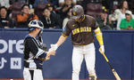 [OSEN=고척, 이대선 기자] 17일 서울 고척스카이돔에서 ‘메이저리그 월드투어 서울 시리즈 2024’ 샌디에이고 파드리스와 팀 코리아의 경기가 열렸다.1회말 샌디에이고 김하성이 타석에 들어서며 대한민국 포수 김형준과 인사 하