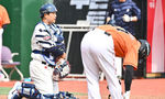 [OSEN=부산, 이석우 기자] 17일 부산 사직구장에서 2024 신한 SOL 뱅크 KBO 리그 롯데 자이언츠와 한화 이글스의 시범경기가 열렸다. 롯데 자이언츠 유강남이 선발 투수 윌커슨의 투구에 맞고 괴로워하고 있다. 2024.03.17 / foto0307@osen.co.