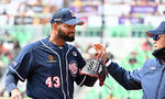 [OSEN=고척, 이대선 기자] 17일 서울 고척스카이돔에서 ‘메이저리그 월드투어 서울 시리즈 2024’ LA 다저스와 키움 히어로즈의 연습경기가 진행됐다.1회초 LA 오타니가 타석에 들어서며 키움 김동헌 포수와 인사하고 있다. 2024. 03.