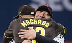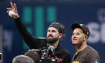[OSEN=고척, 지형준 기자] 18일 서울 고척스카이돔에서 ‘메이저리그 월드투어 서울 시리즈 2024’ 샌디에이고 파드리스와 LG 트윈스의 연습경기가 진행됐다.경기를 마치고 샌디에이고 매니 마차도가 팀 동료 김하성, LG 김현수와
