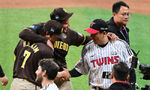 [OSEN=고척, 지형준 기자] 18일 서울 고척스카이돔에서 ‘메이저리그 월드투어 서울 시리즈 2024’ 샌디에이고 파드리스와 LG 트윈스의 연습경기가 진행됐다.경기를 마치고 샌디에이고 매니 마차도와 LG 김현수가 인사를 나누고 있