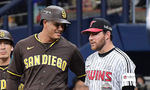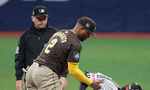 [OSEN=고척, 지형준 기자] 18일 서울 고척스카이돔에서 ‘메이저리그 월드투어 서울 시리즈 2024’ 샌디에이고 파드리스와 LG 트윈스의 연습경기가 진행됐다.6회초 샌디에이고 매니 마차도가 출루해 LG 오스틴 딘과 대화를 나누고