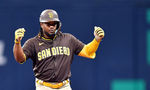 [OSEN=고척, 지형준 기자] 18일 서울 고척스카이돔에서 ‘메이저리그 월드투어 서울 시리즈 2024’ 샌디에이고 파드리스와 LG 트윈스의 연습경기가 진행됐다.4회초 2사 샌디에이고 에기 로사리오가 2루타를 치고 2루에 안착해 기뻐