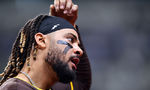 [OSEN=고척, 지형준 기자] 18일 서울 고척스카이돔에서 ‘메이저리그 월드투어 서울 시리즈 2024’ 샌디에이고 파드리스와 LG 트윈스의 연습경기가 진행됐다.5회초 샌디에이고 페르난도 타티스 주니어가 외야 뜬공을 친 뒤 물러나