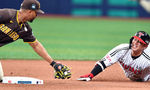 [OSEN=고척, 지형준 기자] 18일 서울 고척스카이돔에서 ‘메이저리그 월드투어 서울 시리즈 2024’ 샌디에이고 파드리스와 LG 트윈스의 연습경기가 진행됐다.4회말 무사 선두타자로 나선 LG 홍창기가 2루까지 뛰었지만 샌디에이고 2