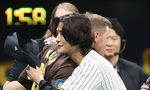 [OSEN=고척, 지형준 기자] 18일 서울 고척스카이돔에서 ‘메이저리그 월드투어 서울 시리즈 2024’ 샌디에이고 파드리스와 LG 트윈스의 연습경기가 진행됐다.가수 겸 배우 로운이 시구자로 나서 선수단과 포옹하고 있다. 2024.03.18 /