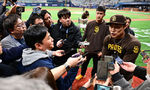 [OSEN=지형준 기자] 18일 서울 고척스카이돔에서 ‘메이저리그 월드투어 서울 시리즈 2024’ 샌디에이고 파드리스와 LG 트윈스의 연습경기가 진행됐다.샌디에이고 김하성이 인터뷰를 하고 있다. 2024.03.18 /jpnews@osen.co.kr