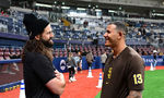 [OSEN=지형준 기자] 18일 서울 고척스카이돔에서 ‘메이저리그 월드투어 서울 시리즈 2024’ 샌디에이고 파드리스와 LG 트윈스의 연습경기가 진행됐다.경기에 앞서 샌디에이고 매니 마차도와 LG 켈리가 인사를 나누고 있다. 2024.03.18