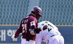 [OSEN=잠실, 지형준 기자] 19일 서울 잠실야구장에서 ‘2024 신한 SOL Bank KBO리그’ 시범경기 LG 트윈스와 키움 히어로즈의 경기가 열렸다.7회초 1사에서 키움 송성문이 1루땅볼에 LG 이우찬의 실책을 틈타 세이프되고 있다. 2024.03.19 /j