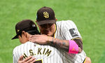[OSEN=고척돔, 지형준 기자] 20일 오후 서울 고척스카이돔에서 ‘MLB 월드투어 서울 시리즈’ LA 다저스와 샌디에이고 파드리스의 개막 경기가 열렸다. 경기에 앞서 샌디에이고 김하성이 그라운드에 들어서며 마차도와 포옹을 하