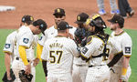 [OSEN=고척돔, 지형준 기자] 20일 오후 서울 고척스카이돔에서 ‘MLB 월드투어 서울 시리즈’ LA 다저스와 샌디에이고 파드리스의 경기가 열렸다. 8회초 마운드를 방문한 샌디에이고 파드리스 니에블라 코치가 선수들과 이야기를