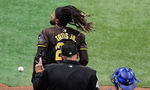 [OSEN=고척돔, 이대선 기자] 21일 오후 서울 고척스카이돔에서 ‘MLB 월드투어 서울 시리즈’ LA 다저스와 샌디에이고 파드리스의 경기가 열렸다.1회초 무사 1루 샌디에이고 타티스 주니어가 몸에 맞는 볼에 격분하고 있다. 2024.03.