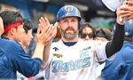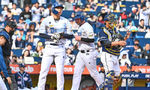 [OSEN=창원, 이석우 기자] 23일 창원 NC파크에서 2024 신한 SOL 뱅크 KBO 리그 NC 다이노스와 두산 베어스의 개막 경기가 열렸다. NC 다이노스 데이비슨이 7회말 2사 만루 김주원의 밀어내기 볼넷때 득점을 올리고 하이파이브를 하고 있