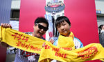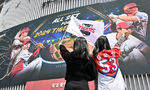 [OSEN=지형준 기자]] 23일 오후 서울 잠실야구장에서 ‘2024 신한 SOL Bank KBO리그’ LG 트윈스와 한화 이글스의 공식 개막전 경기가 열렸다.LG 팬이 우승 트로피 앞에서 포즈를 취하고 있다. 2024.03.23 /jpnews@osen.co.kr