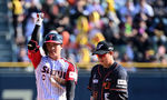[OSEN=잠실, 지형준 기자] 24일 오후 서울 잠실야구장에서 ‘2024 신한 SOL Bank KBO리그’ LG 트윈스와 한화 이글스의 경기가 열렸다.3회말 1사 1,3루에서 LG 박해민이 1타점 적시타를 날리며 기뻐하고 있다. 2024.03.24 /jpnews@osen.co.kr