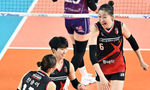 [OSEN=대전, 조은정 기자]24일 대천 충무체육관에서 도드람 2023~2024 V-리그 플레이오프 2차전 정관장과 흥국생명의 경기가 열렸다.1세트 정관장 김세인, 메가, 지아가 파이팅을 외치고 있다. 2024.03.24 / cej@osen.co.kr