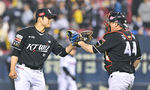 [OSEN=잠실, 박준형 기자] KT 위즈가 디펜딩챔피언 LG를 잡고 2연패에서 탈출했다. KT는 5일 잠실구장에서 진행된 LG 트윈스와의 원정경기서 연장 10회초 김민혁의 결승 2루타로 8대7로 승리했다.경기종료 후 KT 박영현과 김준태 포수