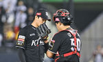 [OSEN=잠실, 박준형 기자] 5일 오후 서울 잠실구장에서 ‘2024 신한 SOL BANK KBO리그’ LG 트윈스와 KT 위즈의 경기가 진행됐다.이날 LG는 임찬규가, KT는 원상현이 선발투수로 나선다. 7회말 1사 2루 LG 오지환의 헛스윙 삼진때 KT 강백호