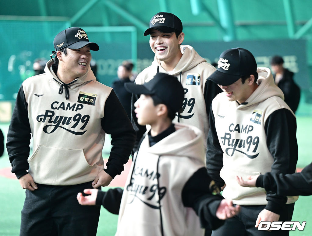 한화 강백호-문동주-문현빈이 유소년 선수들 지도에 나서며 미소짓고 있다. 2025.12.17 / dreamer@osen.co.kr