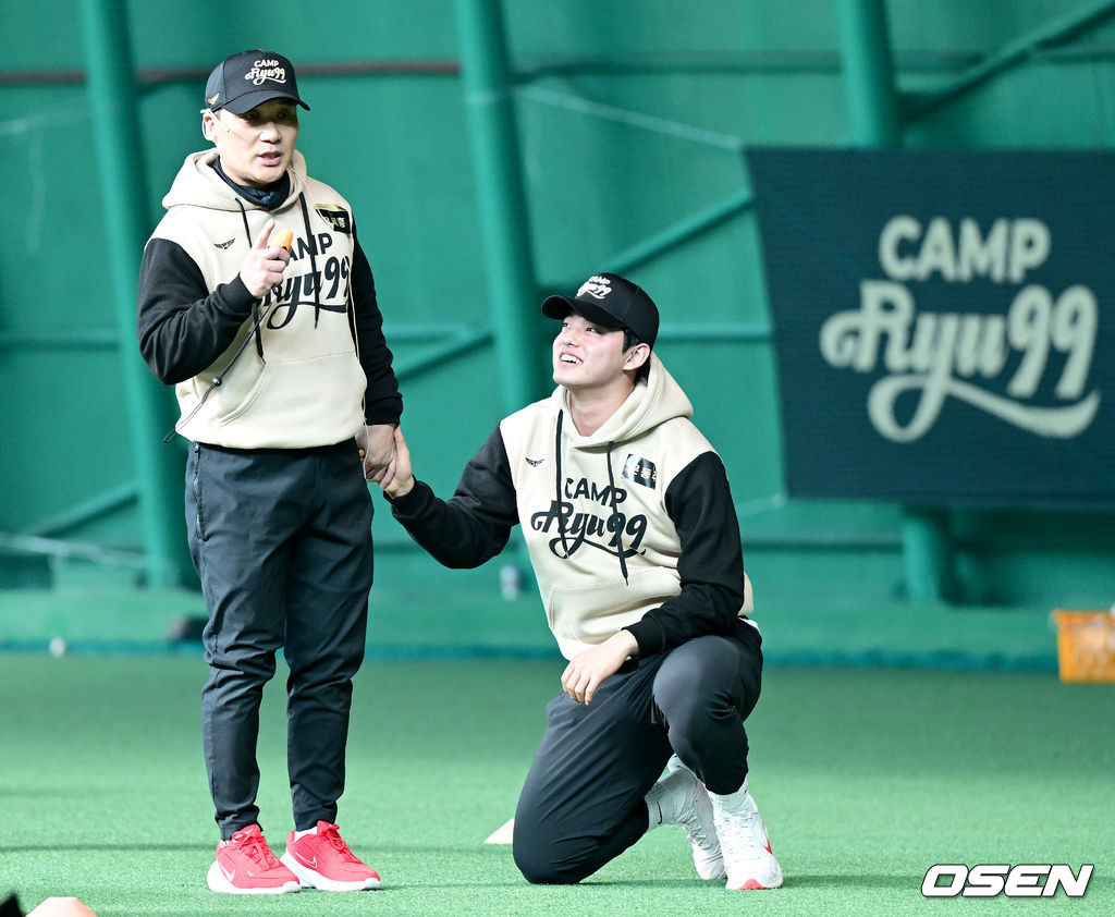한화 장세홍 코치와 문동주가 유소년 선수들과 몸을 풀고 있다. 2025.12.17 / dreamer@osen.co.kr