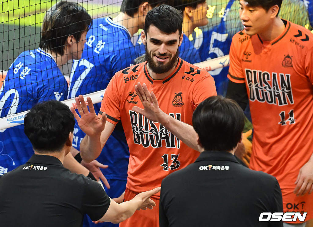 OK저축은행 디미트로프가 세트스코어 3-1로 승리한 후 신영철 감독과 기쁨을 나누고 있다. 2025.12.30 / foto0307@osen.co.kr