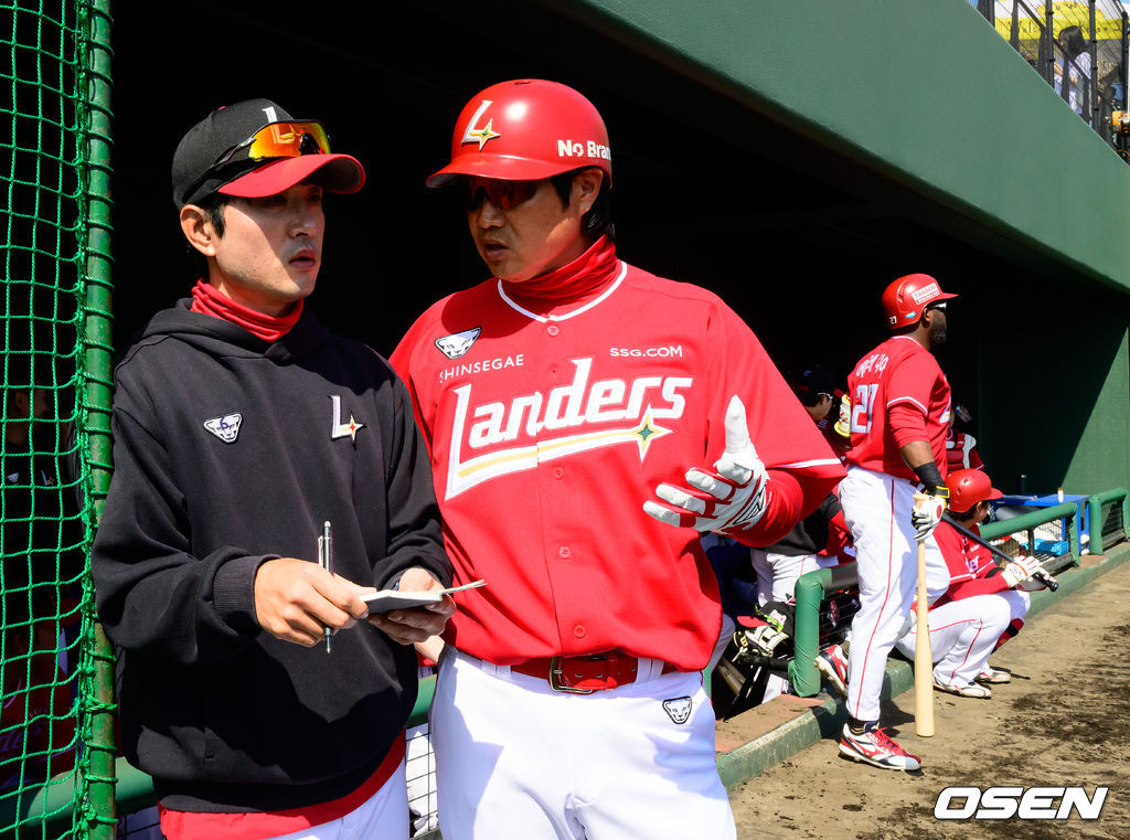 SSG 김성현 코치가 윤재국 코치와 이야기를 나누고 있다. 2026.02.28 /jpnews@osen.co.kr