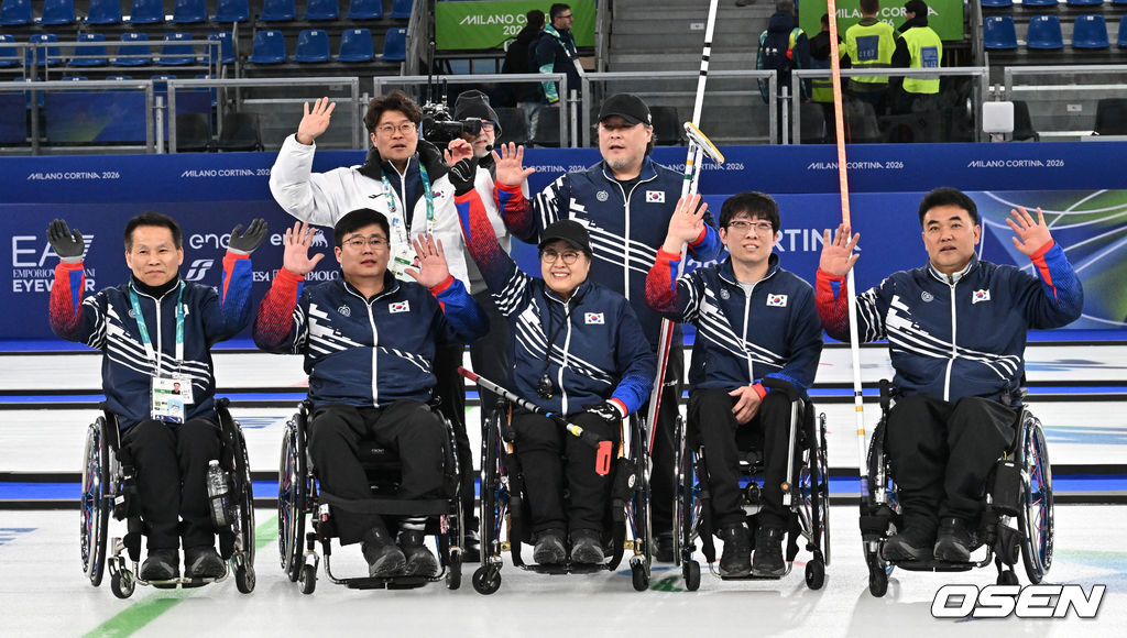 휠체어컬링 양희태, 이현출, 방민자, 남봉광, 차진호, 임성민 감독, 이충용 코치(아래 왼쪽부터 시계반대방향)가 12일(현지시간) 이탈리아 코르티나담페초 컬링 올림픽 스타디움에서 열린 2026 밀라노 코르티나 패럴림픽 휠체어컬링 혼성 4인조 이탈리아와의 예선전에서 승리 후 관중들에게 인사를 하고 있다. 2026.03.13 /cej@osen.co.kr