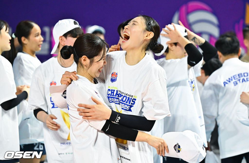 경기종료 후 한국도로공사 이윤정과 배유나가 우승 기쁨을 나누고 있다. 2026.03.13 / soul1014@osen.co.kr