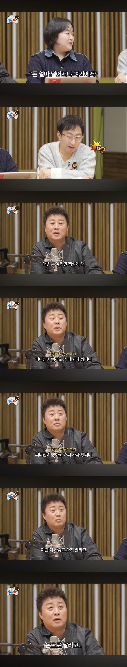 여기에 정준하의 추가 폭로가 이어졌다. 그는 “PD가 빵이랑 커피를 사다 줬는데 이런 거 말고 돈으로 달라고 하더라”고 밝혀 웃음을 더했다.