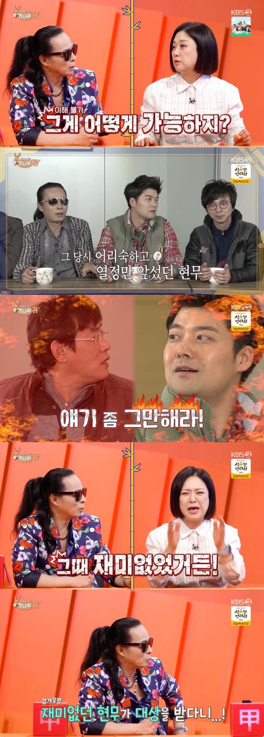 김태원은 과거 전현무와 ‘남자의 자격’에 함께 출연했던 때를 언급했다. 그는 “그때는 뭘 잘 모르는 느낌으로 얼떨떨한 분위기였다. 경규 형이 그래서 많이 혼을 냈다”라며, “그때 재미 없었다. 대상이라는 것은”이라고 저격했다. 전현무는 당황하면서도 폭소했다.