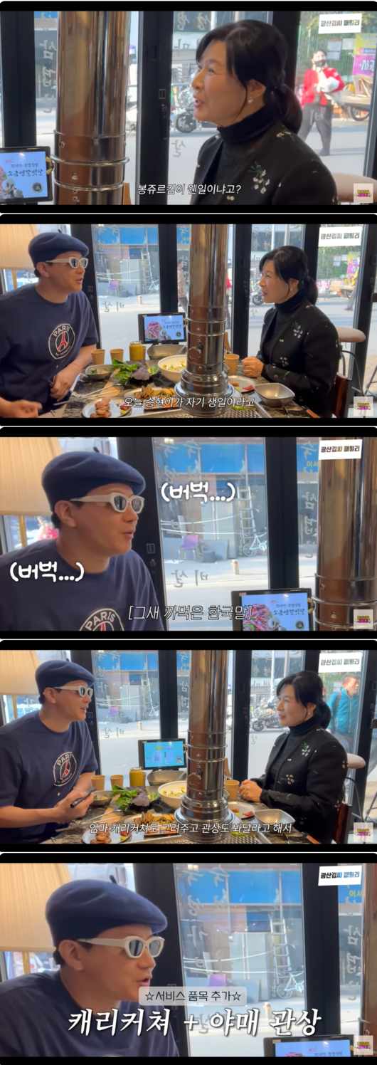 김승현은 식사 자리에서 선글라스에 화백 모자로 정체를 숨긴 ‘봉쥬르 킴’이라는 부캐릭터로 등장했다. 아들의 생뚱맞은 차림새를 목격한 백 여사는 “봉쥬르 이 친구 웬일이야”라며 황당 섞인 반응을 보였으나, 김승현은 아랑곳하지 않고 능청스럽게 연기를 이어갔다.
