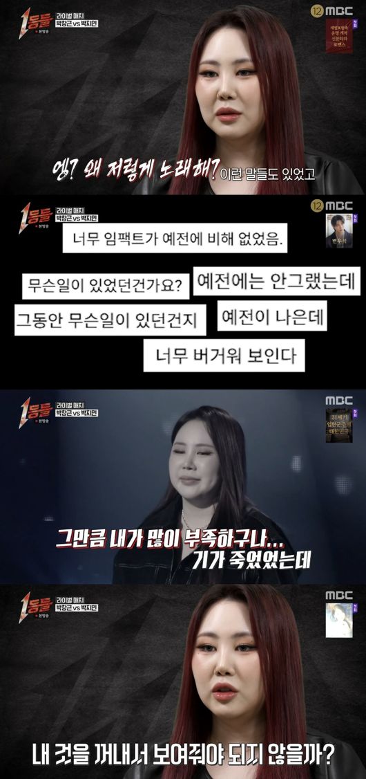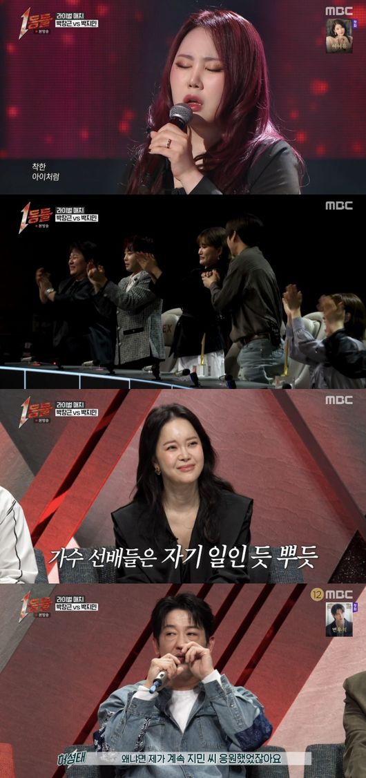 22일 방송된 MBC 예능 ‘1등들’에서는 1:1 라이벌 매치가 꾸며진 가운데 박지민이 가창력 논란을 극복하고 완벽한 무대를 선보였다.