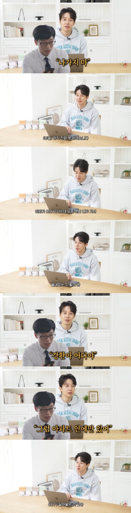 허경환은 "아직 (유재석 형님한테는) 전화를 못하겠다"며 "전화가 오긴 오시는데..."라고 말문을 열었다. 그는 "요즘 맨날 내가 가서 쓸데없는 짓 할까봐 (전화가 와서) '경환아 어디야?'라고 묻는다. '저 헬스장 가려고요'라고 하면, '헬스장이 어딘데? 나가지 마'라고 하신다. '아파트 헬스장이요' 하니까, '그럼 아파트 안에만 있어'라고 하셨다"고 고백해 웃음을 안겼다.
