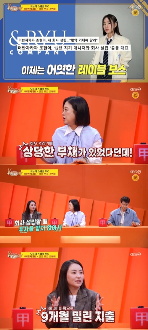 조현아는 최근 12년 지기 매니저와 회사를 설립해 공동 대표가 됐다. 소속사 대표인 조현아는 "내가 투자를 받지 않고 사비로 소속사를 설립했다"며 "회사 설립 초기에 9개월 동안 헤어 및 메이크업 비용을 한 번에 정산하고 나니 통장 잔고가 40만원에 남았다"고 밝혔다.