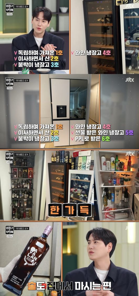 규현은 “제가 숙소 생활을 18년 했다. 이사를 혼자 하게 되면서 그걸 가지고 들어왔다. 또 새로 사고, 붙박이 냉장고, 와인 냉장고, 또 선물 받은 와인 냉장고, 유튜브 해서 PPL로 받아서 총 6대가 됐다”고 밝혔다.