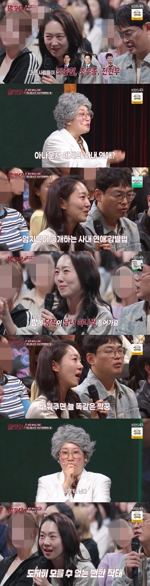이날 직장인들의 사내 연애에 대한 이야기가 나왔고, 말자 할매 김영희는 "아나운서들의 사내 연애는 우리가 알만한 게 있냐?"고 궁금해했다. 엄지인 아나운서는 "사내연애 많이 봤다. 사귀는지, 안 사귀는지 다 아는 방법이 있다"고 귀띔했다.