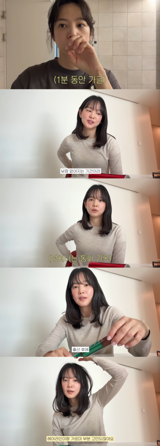 윤승아는 “제가 단발하는 이유가 다른 분위기 연출도 있고, 예뻐 보이기도 하는데 긴머리를 더 선호한다. 단발은 계속 잘라줘야 하니까”라며 “머리가 길면 단점이 무게감 때문에 두피가 더 예민해지고 아프다. 두피가 건조하고 자극되는 느낌이 들면 발라준다”고 설명했다. 또한 윤승아는 “출산하신 분들은 아시겠지만 헤어라인과 가르마 부분이 고민이 된다. 확실히 관리를 하다보면 정수리랑 헤어라인은 잘 유지되는 것 같다”고 전했다.